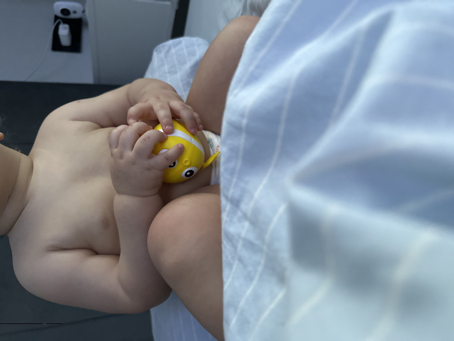 - "A baby is seated on a light-colored, likely striped, sheet covering a bed" by FM-kFCat1, licensed under CC BY 4.0