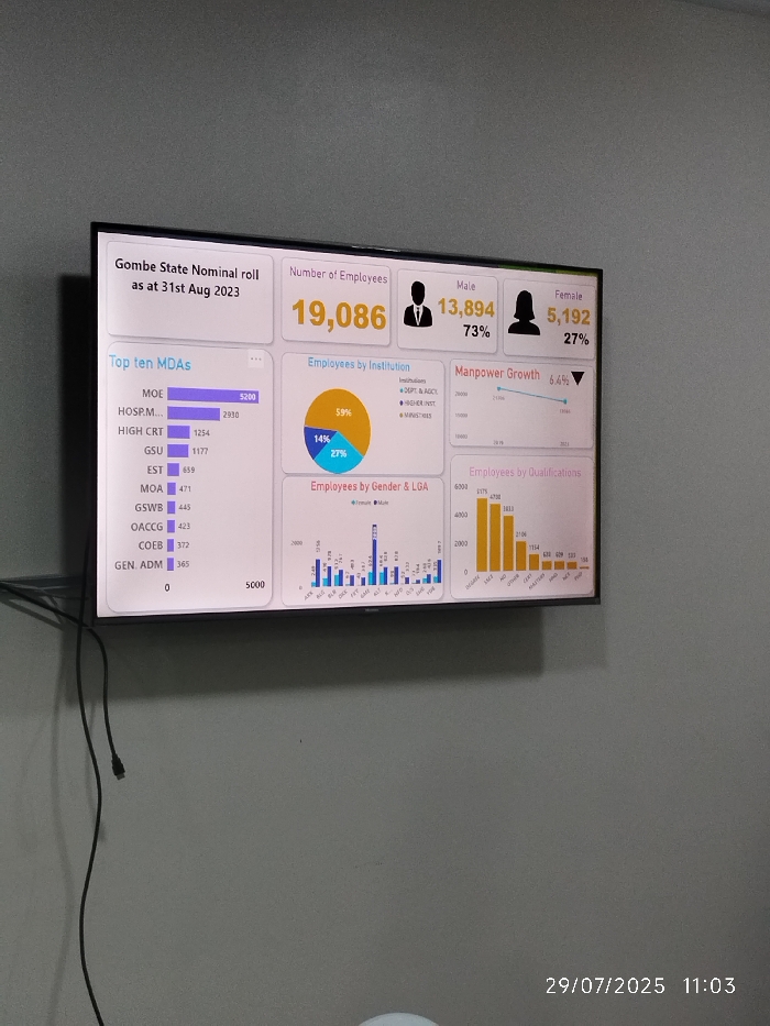 A wall-mounted black-framed television displays a digital dashboard titled "Gombe State Nominal roll as at 31st Aug 2023