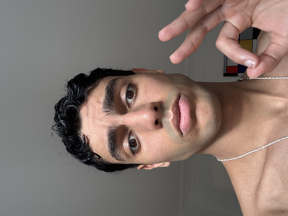 A young adult male, likely in an indoor residential or studio environment within Neuilly-sur-Seine, France, is depicted in a close-up, head-and-upper-torso shot