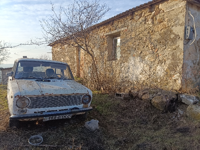 A dilapidated white car sits in front of a weathered stone building. The car shows significant rust and decay, with a partially obscured license plate. The building, constructed of rough-hewn stones, has boarded-up windows and a decaying exterior. Sparse vegetation and bare branches surround the scene, suggesting a neglected or abandoned environment. A small electrical box is attached to the building's corner.
