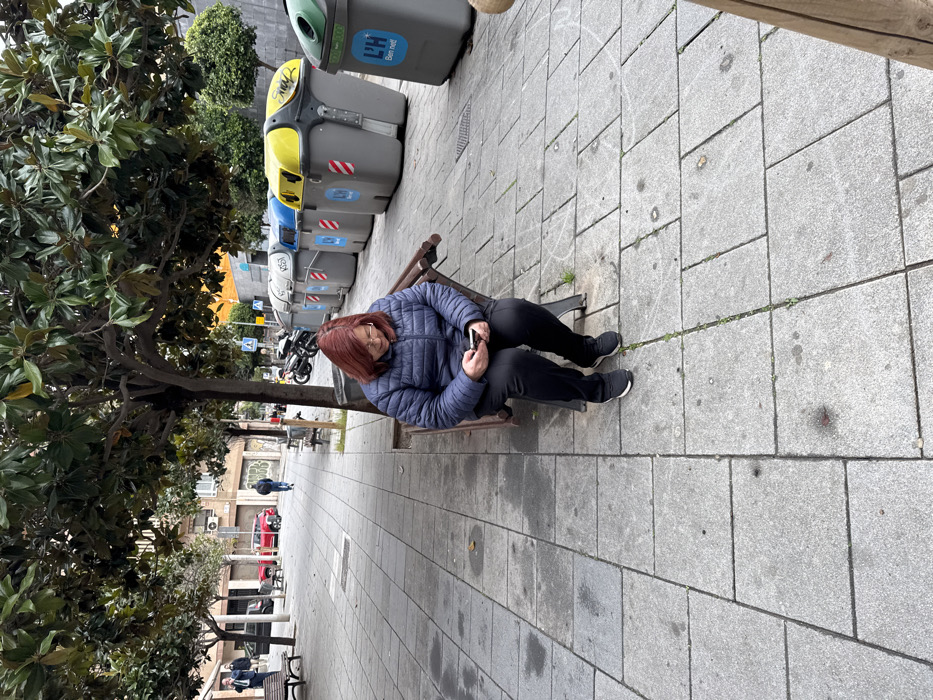 A wide-angle shot captures a daytime urban scene on a grey tiled pedestrian street or plaza in L'Hospitalet De Llobregat, Spain. In the foreground, a middle-aged individual with reddish-brown hair and glasses, dressed in a dark blue puffer jacket, black trousers, and black sneakers, is seated on a dark brown slatted park bench. Their head is tilted downwards, eyes fixed on a white smartphone held horizontally in both hands. To the right of the street, a row of seven large, grey recycling bins with variously colored lids (yellow, blue, green) are visible. These bins bear "L'H" and "L'H ben net" branding, confirming the location. Some bins feature red and white striped hazard markings. Further back, on the left side of the street, a red pickup truck is parked. Several motorcycles are parked on the right side, behind the recycling bins. Trees with dense, dark green foliage line the street, casting diffuse shadows. In the background, indistinct figures are visible walking on the street, including one male figure walking away from the camera. Buildings line the street, one displaying graffiti. The grey pavement shows signs of wear, moisture, and small patches of weeds between the tiles. A blue pedestrian crossing sign is visible in the mid-ground. The lighting is consistent with an overcast day.
