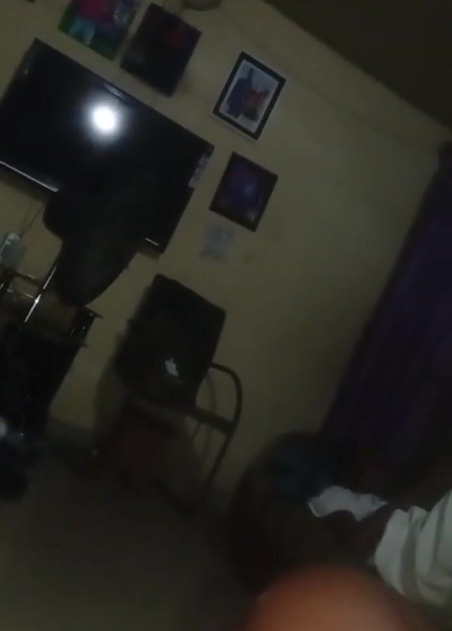 dimly lit room, likely a living room or bedroom. A television is mounted on the wall, and a standing fan is positioned in front of it. The room also contains a small refrigerator, a chair, and various framed pictures hanging on the wall. There's an obscured object in the foreground. The video appears to be taken with a shaky camera, and the lighting is poor.