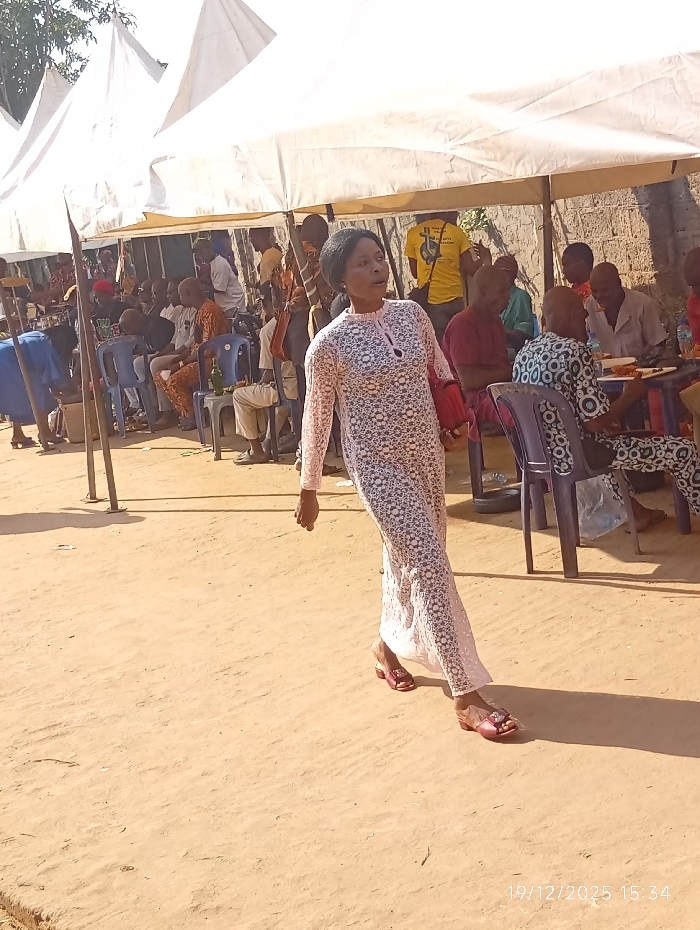 A woman in a long, white, patterned dress walks across a dirt-covered area. She wears red sandals. Behind her, under white canopies, a crowd of people sit in chairs around tables. Some are eating, and some are talking. A yellow shirt with an image on it is visible. The photo is taken in bright daylight. A date stamp "19/12/2025 15:34" is in the lower right corner.