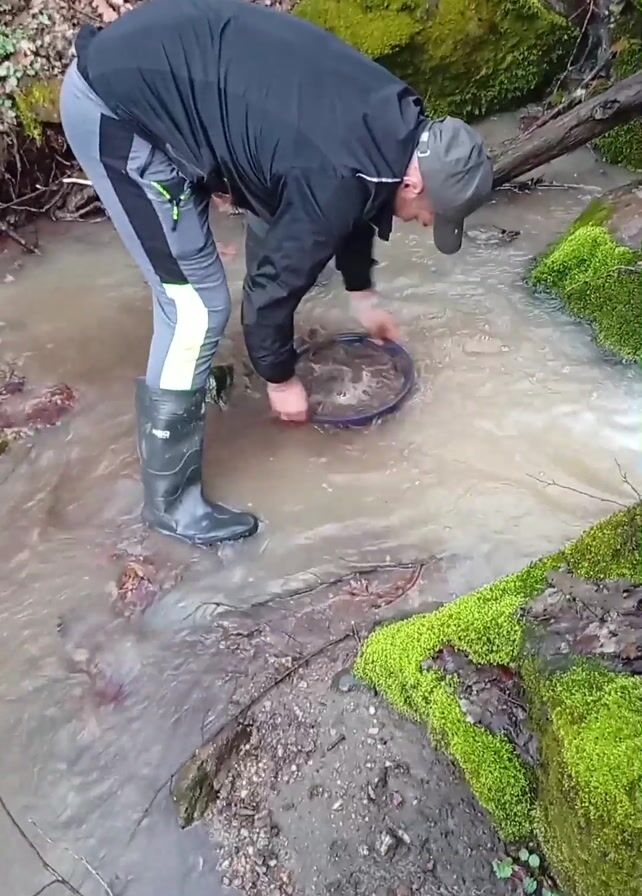 A man wearing a black jacket, grey and neon yellow pants, a baseball cap, and black rubber boots is gold panning in a small creek. He is bent over, holding a blue panning dish filled with sediment and water, and is agitating it in the stream. The creek is surrounded by mossy rocks and vegetation. The water is murky and flowing.
