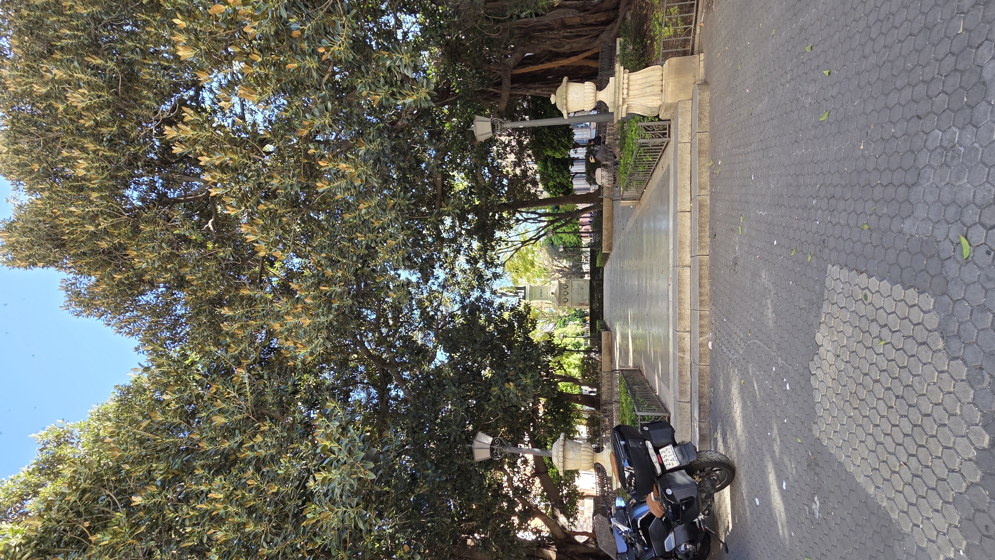 The image captures an exterior view within the Jardines de Murillo in Sevilla, Spain. A wide, light-colored pedestrian pathway, composed of rectangular segments, leads from the mid-ground towards the Monumento a Diego Velázquez in the distance. This path is elevated and accessible via three concrete steps from the foreground's hexagonal paver surface. On the immediate left, a black BMW touring motorcycle, equipped with hard panniers and a top case, is parked on the hexagonal pavement. Its rear license plate, "2953 KXL," is visible. Flanking the entrance to the raised path are two identical decorative lampposts, each with a dark fixture atop a fluted stone urn. These are positioned behind low, dark metal railings that separate the path from landscaped areas with green hedges. The pathway is lined on both sides by extremely large, mature trees, consistent with Ficus macrophylla, characterized by their expansive canopies of dark green leaves and visible aerial roots. Sunlight filters through the foliage, creating patches of light and shadow. In the mid-ground, on the right side of the path, two individuals are seated on a bench beneath the trees. A third person is partially visible on a bench on the left side. The background is dominated by the Monumento a Diego Velázquez, consisting of a dark equestrian statue mounted on a large, light-colored stone pedestal, centered at the end of the path. Beyond the monument, more trees and the upper portions of distant buildings are visible under a clear, bright blue sky. The ground in the foreground is paved with dark gray hexagonal blocks, with some scattered green leaves and minor debris present.