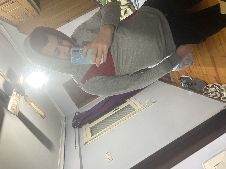 - "A person in a grey and maroon hoodie, black pants, and white shoes takes a selfie in a bedroom" by FM-ekT8x1, licensed under CC BY 4.0
