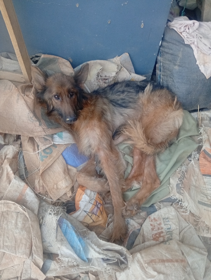 A German Shepherd dog lies amidst discarded sacks. The dog's coat is a mix of brown, tan, and black fur. Its body appears thin, and its legs are stretched out. The background is a mottled blue wall with a piece of wood leaning against it. A large sack, partially covered with a white cloth, sits behind the dog's head. The environment appears cluttered and unclean.