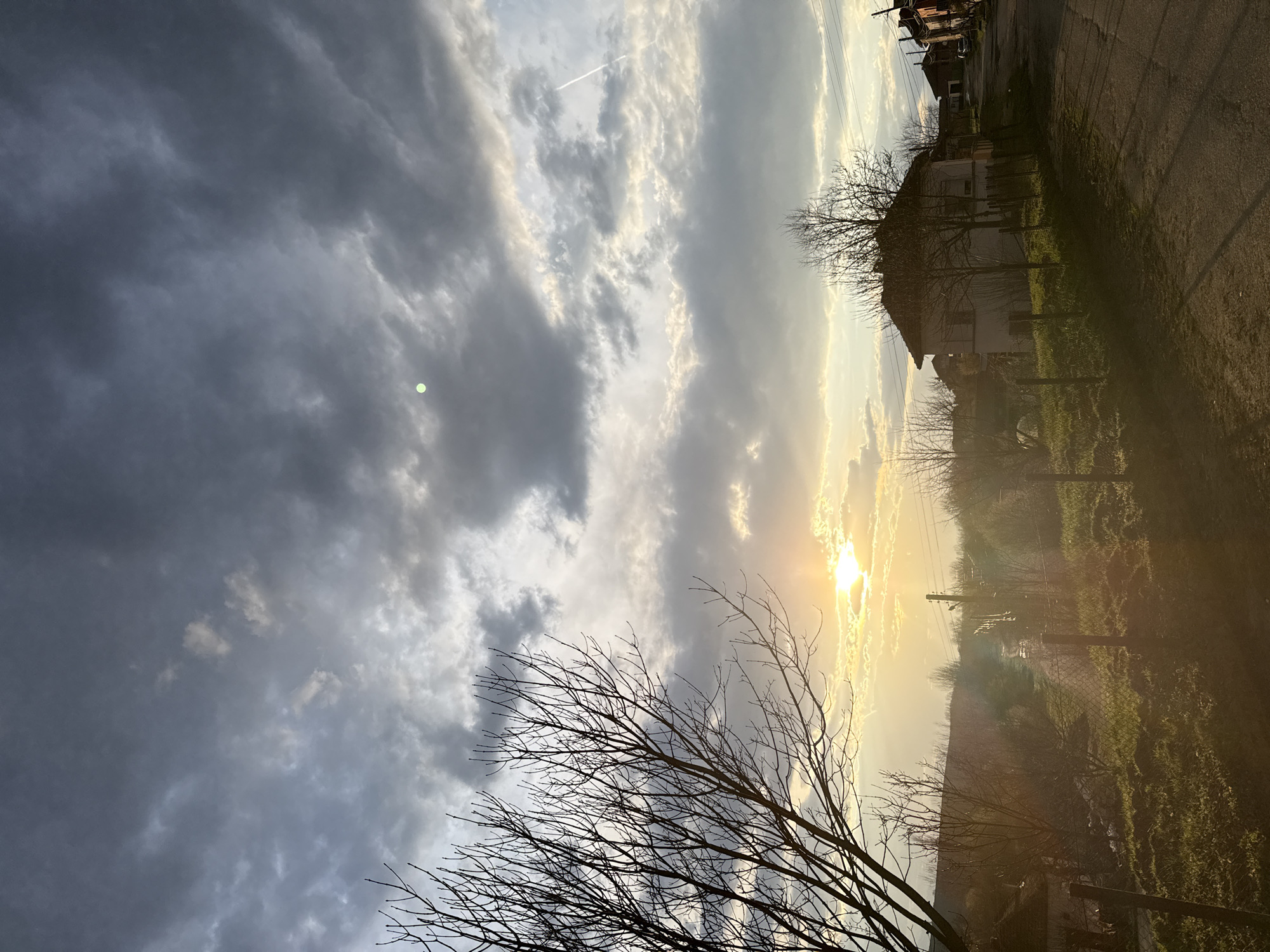 This image depicts a rural or semi-rural scene in Lilyache, Bulgaria, under a dramatic sky at either sunset or sunrise. The sky dominates the upper two-thirds of the frame, filled with a mix of dark grey stratocumulus clouds and brighter, partly illuminated altocumulus clouds. The sun is low on the horizon, positioned in the lower-middle-left, casting a brilliant golden-orange glow through a break in the clouds. A distinct green lens flare is visible in the upper-left quadrant of the sky, and a faint white contrail from an aircraft is present in the upper-right. In the left foreground, the silhouetted branches of a large, bare deciduous tree extend upwards, filling a significant portion of the left side. The ground beneath the tree and stretching across the midground consists of patchy green grass and exposed soil, segmented by a wire fence with wooden posts running horizontally across the center. A dirt or unpaved road is visible on the right, curving gently into the distance and illuminated by the low sun, creating long shadows. In the mid-right, a two-story house with a dark, sloped roof and light-colored walls is partially visible, appearing to be set back from the road behind additional bare trees. Other distant structures and power lines are discernible along the road as it recedes into the background. No people or animals are present, and no active interactions or specific actions are depicted within the frame. The overall environment suggests an early spring or late autumn setting due to the bare trees and ground cover.