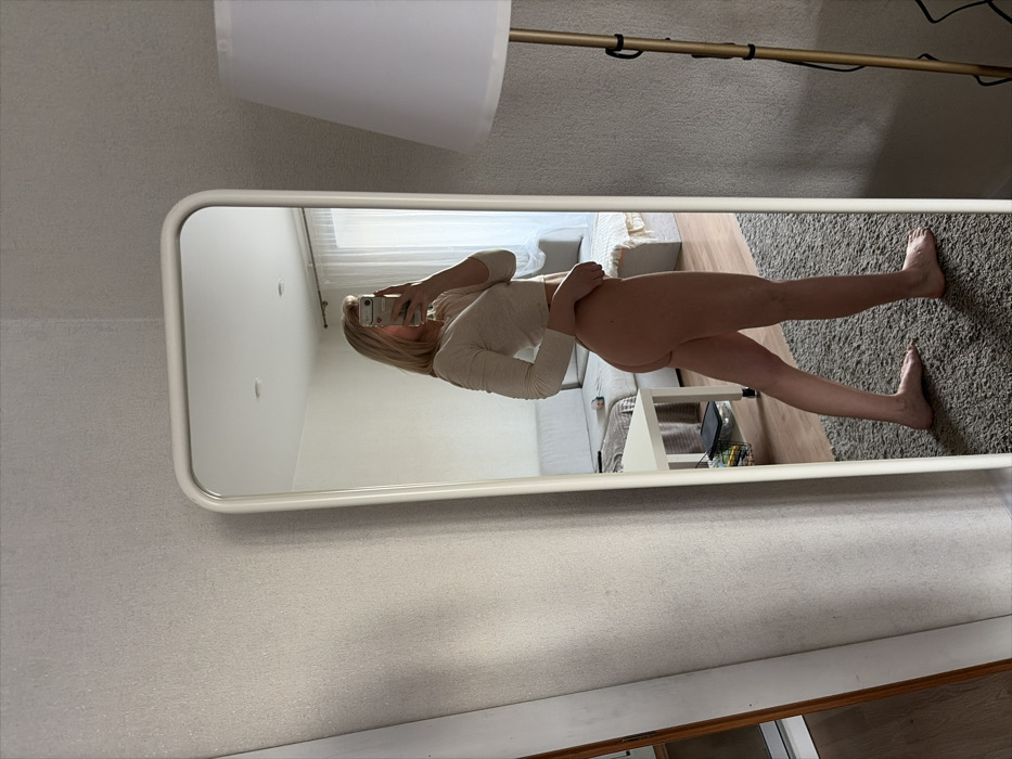 An interior scene captured in a full-length mirror, depicting a fair-skinned individual, presumably female, with blonde hair, taking a selfie in what appears to be a residential living space in Chaikovsky, Russia