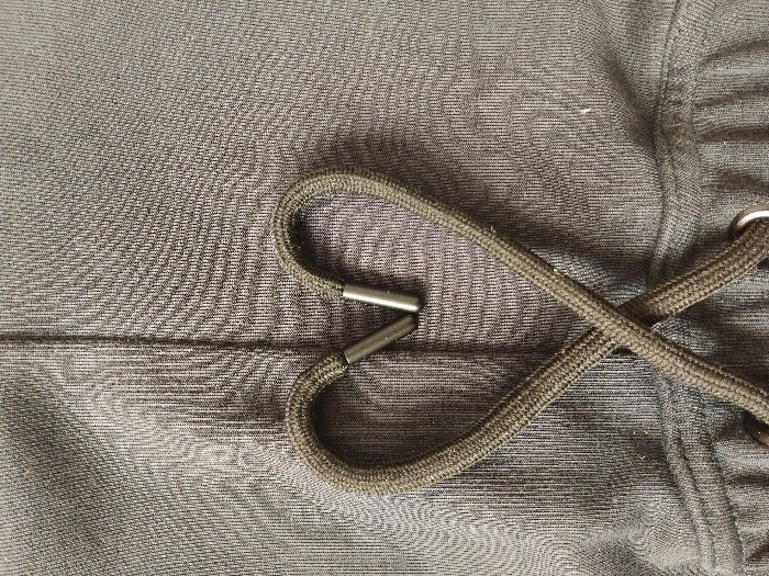 The scene is located in the city of Kazanlak, Bulgaria. The image presents a vertical, close-up view of a dark olive-green braided drawstring arranged into a heart shape against a textured, dark gray or black fabric background. The drawstring's two ends meet at the top point of the heart, each capped with a dark metallic aglet. The strands cross at the bottom center of the heart. The fabric exhibits a fine, consistent vertical weave pattern and a central vertical seam or fold. Towards the bottom of the frame, two circular metallic eyelets are partially visible, through which the drawstring would typically pass. No individuals, further objects, or broader environmental details are visible.
