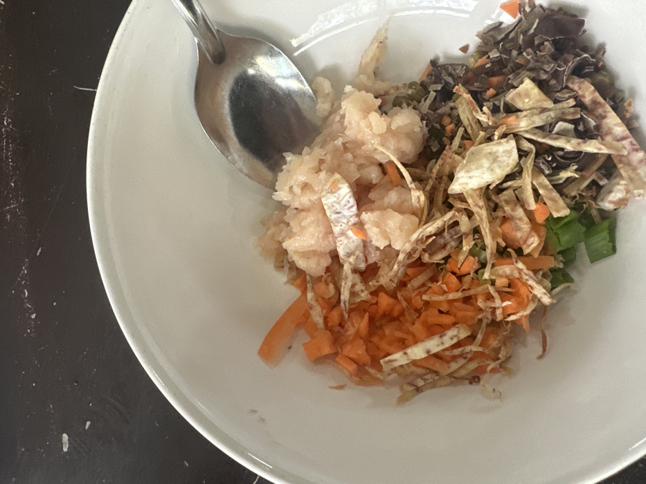 A white bowl holds a mix of food, including shredded carrots, chopped green onions, and a light-colored, minced protein