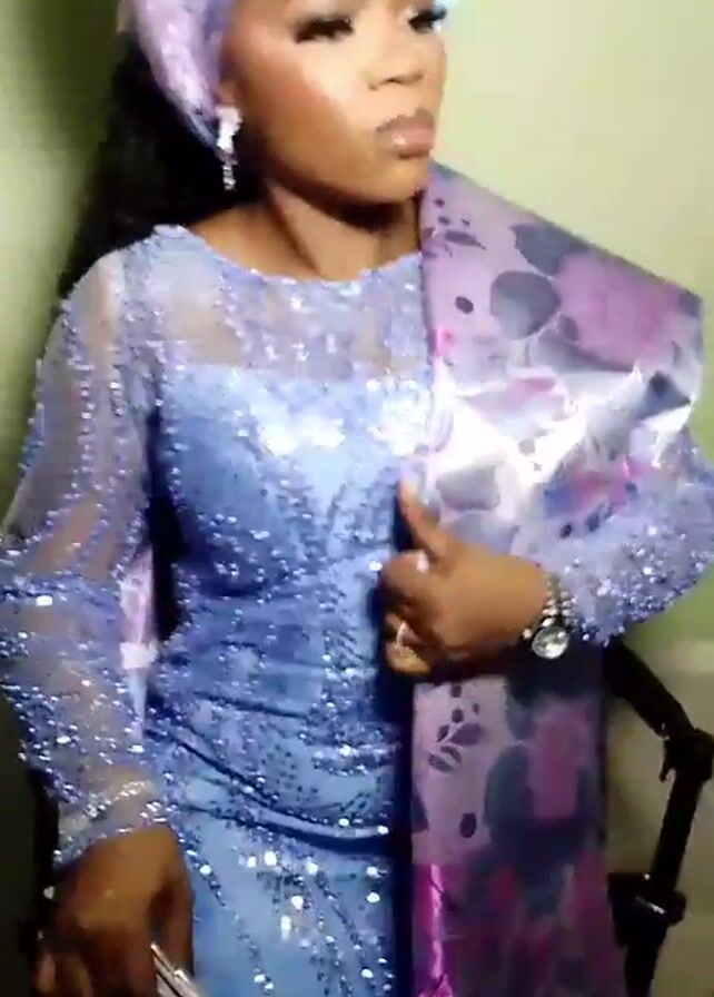 woman standing indoors. She is wearing a light blue, beaded, long-sleeved dress, a purple headwrap, and a patterned purple shawl draped over her shoulder. She is also wearing jewelry, including earrings and a ring. Her makeup is done, and she appears to be looking off to the side. The background is a light green wall. There are some blurred figures and sounds of people talking in the background. She is holding a clutch bag.