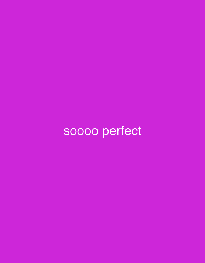 A vibrant purple background fills the frame, serving as the backdrop for a textual message. The phrase "soooo perfect" is prominently displayed in white, sans-serif font. The text is horizontally centered within the frame, lending a sense of balance to the overall composition. The simplicity of the message and the bold color choice create a visually striking image.