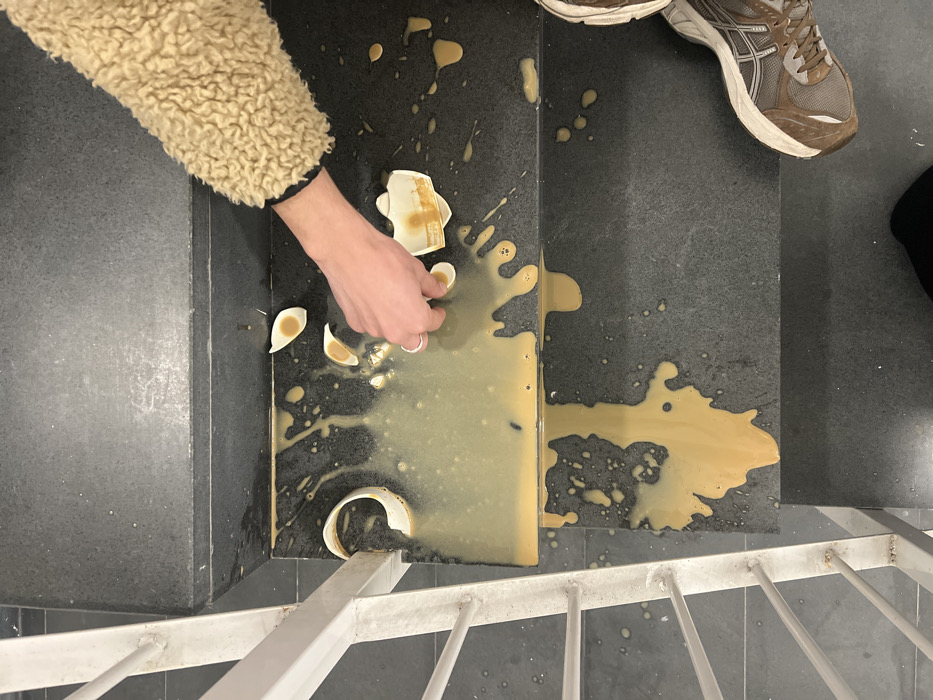 The image displays an indoor scene on a dark grey or black tiled staircase. A white ceramic cup is fragmented into several pieces, scattered on the upper visible stair tread. A significant spill of a light brown, opaque, and somewhat viscous liquid, consistent with coffee or a milky beverage, covers a substantial portion of the upper step and flows down onto the riser and the step below. A person's right arm, covered by a tan, textured, possibly fleece or sheepskin material sleeve, extends from the upper right quadrant into the spillage. The bare right hand, adorned with two rings on the middle and ring fingers, is positioned among the broken ceramic fragments and the spilled liquid, appearing to interact with them. In the lower right corner, a portion of a person's right foot, encased in a brown and white ASICS athletic shoe, is visible on the stair tread below the main spill, with a dark trouser leg partially shown above it. A white, vertically-slatted metal railing system is present along the left edge of the staircase. The specific location within the city of Tel-Aviv, Israel, cannot be determined from the visual evidence provided in the image.