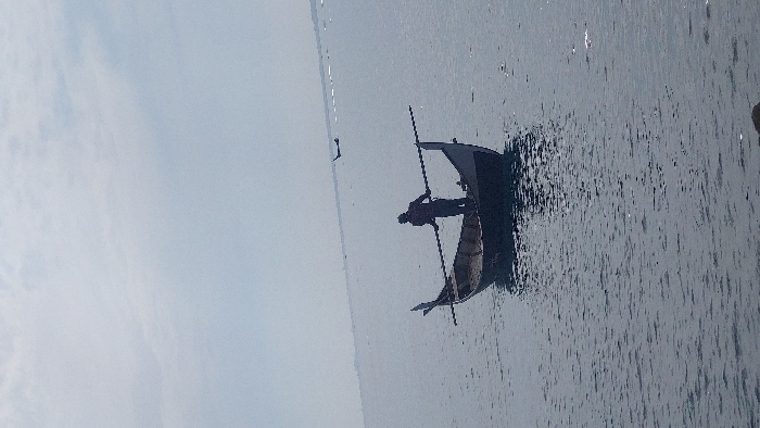 The image depicts an open water scene in Lhokseumawe, Indonesia, under an overcast sky. A lone individual stands upright in the center of a dark, traditional wooden boat with distinct raised bow and stern sections. The person, viewed from behind as a silhouette, holds a long pole horizontally across the width of the boat. The water surface is dark blue-grey with light ripples. In the mid-ground, a smaller, dark, low-profile vessel is visible on the water, with a faint, hazy distant horizon line. The sky above is uniformly light grey with diffuse cloud cover.