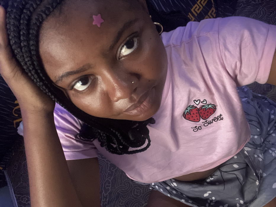 The image depicts a young adult female with dark skin and dark braided hair, posing for a high-angle shot in what appears to be an indoor setting in the stated city of Gbongan, Nigeria. She is lying or reclining on dark patterned bedding. The subject is wearing a light pink, short-sleeved crop top featuring an embroidered design of two red strawberries, three small black hearts, and the cursive text "So Sweet" in black. She is also wearing grey patterned shorts or pajama bottoms with a white leaf-like design. Her right arm is bent, with her hand positioned near her head. Her face is directed towards the camera, displaying a faint smile. A small, shiny stud is present in her left nostril. A pink star-shaped sticker is affixed to her forehead, slightly above and between her eyebrows. A single gold hoop earring is visible in her right ear. The background includes dark fabric with a gold geometric pattern on the right and a grey patterned fabric on the left.