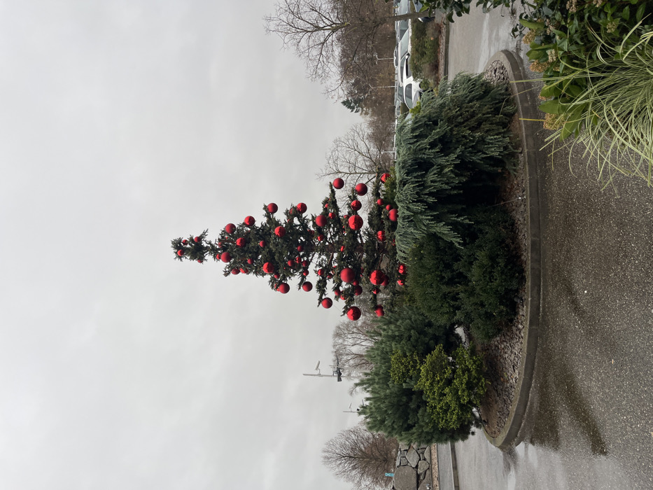 This image depicts an outdoor, urban scene in Ribeauvillé, France, centered on a prominently decorated evergreen tree. The tree, approximately 6-8 meters in height, is densely adorned with numerous large, spherical red ornaments of varying sizes and stands erect within a circular, raised planter. The planter features a concrete curb, filled with dark gravel, and contains an assortment of evergreen shrubs and smaller trees. These include dense, dark green bushes and at least one lighter, blue-green conifer with a weeping habit, primarily located on the right side of the main tree. The foreground consists of wet, dark asphalt pavement, indicating damp conditions or recent precipitation, with reflections visible on its surface. To the immediate right in the foreground, a patch of variegated foliage is partially visible. In the mid-ground and background, on the left side, bare deciduous trees and a stone-faced retaining wall or structure are present, along with what appear to be light poles or utility structures. On the right side, a spacious asphalt parking lot is visible, occupied by numerous parked vehicles, predominantly light-colored cars. Beyond the parking lot, additional bare deciduous trees and a line of evergreen trees form a distant horizon. The sky is uniformly overcast and light grey, contributing to diffuse lighting across the scene. No individuals are visible, and no dynamic actions are depicted.