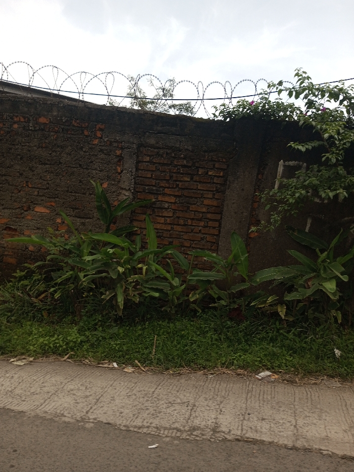 This image depicts an exterior scene in Cibodas, Indonesia, under an overcast sky. In the foreground, a textured concrete path or shoulder, exhibiting parallel grooves and minor cracking, runs horizontally, separated from an unseen darker asphalt road at the very bottom left. Adjacent to the path, a strip of green grass and weeds extends to the base of a perimeter wall. The wall occupies the middle ground, constructed from weathered materials. Its left section is dark gray, roughly textured concrete, while the right portion exposes reddish-brown bricks in a stretcher bond pattern. A darker concrete cap or coping runs along the top of the wall. Mounted atop the entire wall is a continuous line of coiled razor wire (concertina wire), forming distinct loops against the sky. At the base of the wall, a dense arrangement of green foliage is present, consisting primarily of plants with large, elongated leaves, possibly belonging to the Canna or ginger family. To the right, a leafy green bush with small purple flowers emerges above the wall, partially obscuring the razor wire in that section. Further vegetation, possibly tree branches, is silhouetted against the sky behind the razor wire on the left. No individuals or animals are visible. Small white pieces of debris are scattered on the grass and concrete surfaces.