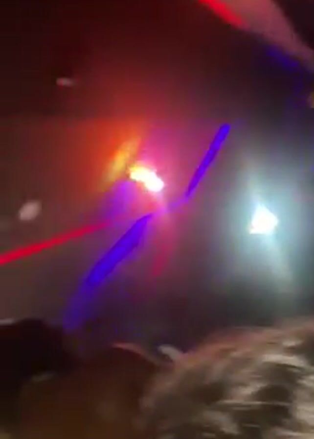dimly lit room with multiple colored lights, including red lasers, and a group of people gathered. Several individuals are standing, while others are seated. One person wears a grey hoodie and another a white t-shirt with green writing. Another person wears a black and white shirt with the word "FAITH" on it. The lighting creates a dance club ambiance. The video appears to be shot from within the crowd.