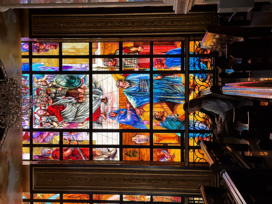 The image displays a large, ornate stained-glass window inside the Heavenly Cathedral in Sharm El Sheikh, Egypt. The window is segmented by a dark grid and is bordered by gold-colored, decorated architectural pillars. The stained-glass artwork depicts several biblical scenes using vibrant colors, including blues, reds, oranges, yellows, and purples. The prominent upper central section illustrates Jesus, clad in a red robe and white tunic, with visibly bound wrists, being led by a group of Roman soldiers. The soldiers wear armor and helmets, and some carry spears, with one soldier holding a large, round, green shield. The lower central section features a bearded man in a blue tunic, extending his right hand, facing a woman in a blue cloak who points towards him. A Roman soldier holding a spear stands to the right of this interaction. Other panes include a white vase and a rooster. Above the window, a dark ceiling with a painted sky motif is visible. A multi-tiered crystal chandelier hangs centrally from this ceiling. In the foreground and midground, multiple dark wooden church pews are arranged, exhibiting reflective surfaces. Two individuals are seated on a pew on the right side of the frame. One person, with light brown hair, is observed in profile facing right, wearing a light-colored top and dark trousers, with hands resting in their lap. Another individual is partially visible behind them. Bright light from the stained-glass window illuminates the interior space and reflects off the pews.