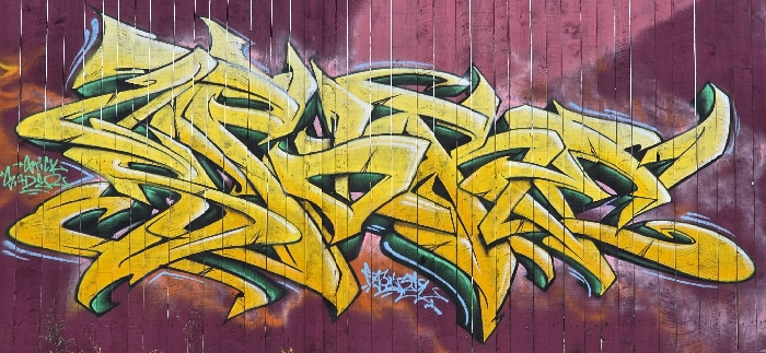 - "The image displays a large graffiti artwork rendered in a complex wildstyle script on a reddish-purple painted wooden fence" by FM-hFjFV2, licensed under CC BY 4.0