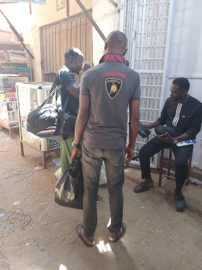 The image depicts an outdoor commercial area in Maiburiji, Nigeria, characterized by an uneven light-colored paved ground under daylight conditions. Three adult males are present. In the foreground, with his back to the viewer, stands a man with a balding head, wearing a grey polo shirt with "LAMBORGHINI" text and a bull logo on the back, dark grey jeans, and dark open-toed sandals. He holds a black plastic bag in his left hand. To his left, partially obscured, a second man stands wearing a dark t-shirt and light green trousers, carrying a black duffel bag over his left shoulder and another black bag across his body. He is looking towards the foreground man. To the right, a third man is seated on a small brown stool. He wears a black long-sleeved tunic with white stripes on the shoulders, black trousers, and dark slip-on shoes. He holds a dark object, possibly a phone or wallet, in his left hand and a white rectangular item, possibly a booklet or magazine, in his lap. He is looking towards the two standing men. The background features various market elements: a glass display case with "MANEMA" visible, displaying goods (possibly electronics or cosmetics), and rolls of fabric on a rack behind it. A wooden structure is visible above the display. To the far right, a light-colored metal gate or barred window is present. The general environment suggests a street market or a commercial alley.