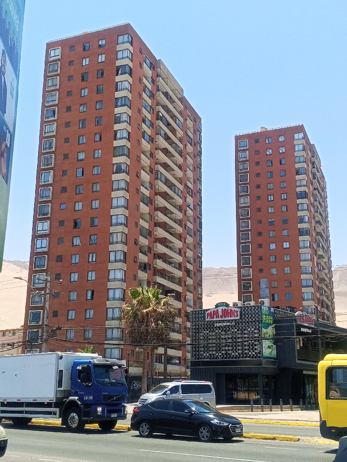 Two tall apartment buildings dominate the scene. One is red with many windows and balconies; the other is a similar red with just windows. A Papa John's restaurant sits between the buildings at street level. Cars and a truck are on the road in front. A palm tree is in front of the buildings. A desert landscape is visible in the background. The sky is light blue.