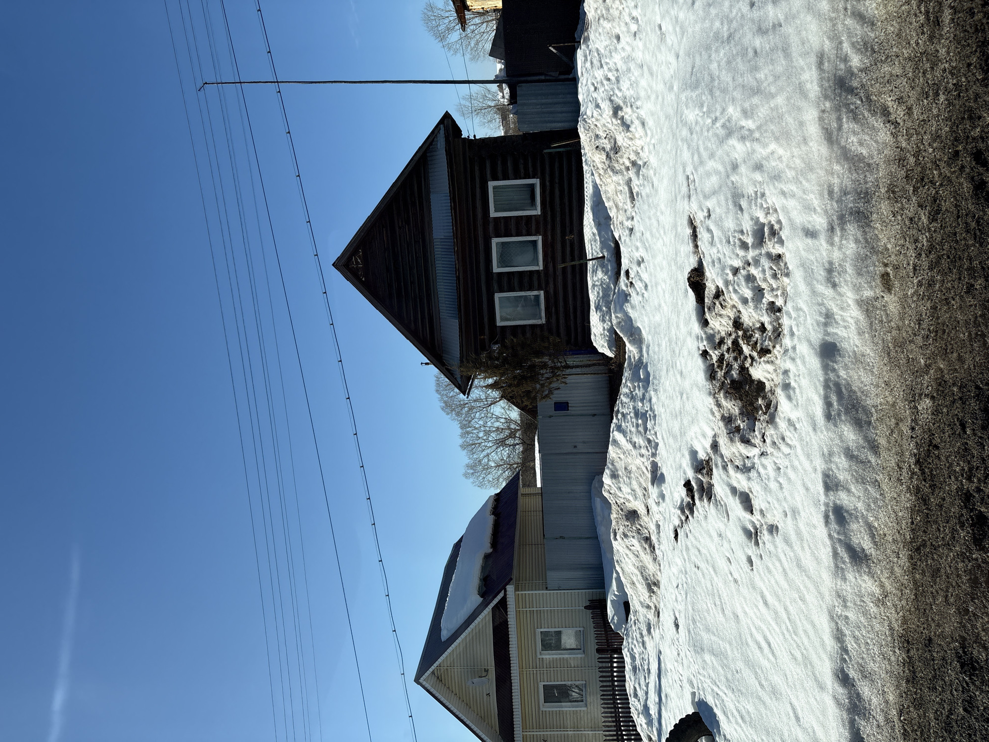 This image depicts a residential street scene in Кварса, Russia, under clear blue skies during what appears to be late winter or early spring. The foreground is dominated by extensive, melting snow, which is dirty brown in patches, particularly in the immediate bottom third of the frame, suggesting a wet, muddy road or pathway. A black tire or wheel is partially visible on the left edge of the foreground snow. Two houses are visible in the midground. To the left, a light-colored, possibly cream or yellow, two-story house with horizontal siding features a dark gable roof, partially covered by a thick layer of snow. A small satellite dish is affixed to its side. A low, dark wooden picket fence stands in front of this house. To the right, a darker, possibly stained or aged, log cabin-style house with a steep gable roof is present. This house has three white-framed rectangular windows on its visible facade and a section of corrugated metal siding below the roof's peak. A small, dark evergreen shrub is located to the left of this house. A corrugated metal fence separates the two houses and extends towards the foreground. In the background, beyond the houses and fences, bare deciduous trees are visible against the horizon. Overhead utility lines, consisting of multiple parallel wires, traverse the upper half of the frame, extending across the clear blue sky. A tall, thin, dark pole or antenna stands vertically next to the dark log cabin house. No individuals or explicit actions are observed within the frame.