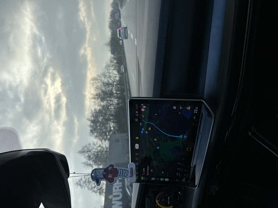 The image presents an interior view from a moving vehicle on a multi-lane highway, identified as the A35, observed near La Wantzenau, France. The central infotainment screen displays a navigation map indicating a route towards Schluchthal, Germany, with the current time as 15:37 and an interior temperature of 22.0 degrees Celsius. A dark dashboard fills the lower frame. A cartoon-style air freshener, depicting a figure on a spring with a red shirt, cap, and "hopser" text, hangs from the rearview mirror. This air freshener partially obscures a large truck on the left side of the road, which bears a visible "WÜRTH" logo. The windshield exhibits fine water droplets. Ahead on the highway, a white sedan proceeds in the right lane, with other distant vehicles visible. The road is flanked by bare deciduous trees under an overcast sky showing some filtered light. No individuals are visible in the image.