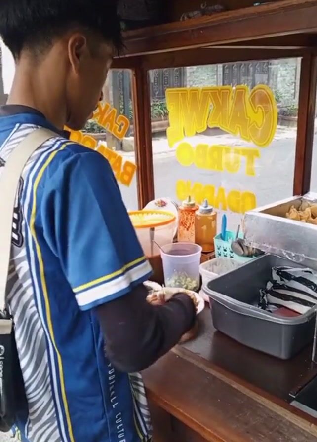 man standing at a street food cart, preparing a plate of food. He is wearing a blue and white patterned shirt with a black undershirt, and a black bag is slung across his shoulder. The cart has a wooden frame and glass windows with yellow lettering that reads "CAKW Turbo." Inside the cart, there are various containers and bottles, presumably holding ingredients and sauces. The man is focused on arranging food on a white plate. Outside the cart, there is a street visible with a building in the background. The weather appears to be overcast.