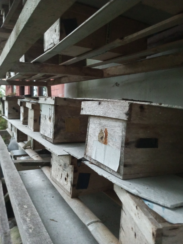 - "The image displays an array of approximately six rectangular wooden structures, consistent with beehives, arranged on two distinct horizontal shelves within a larger wooden framework in Ivato, Madagascar" by FM-3mobU2, licensed under CC BY 4.0