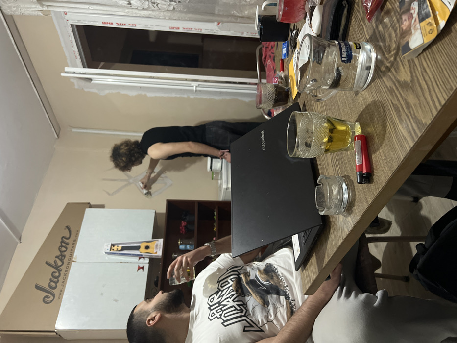 An indoor scene depicts two adult males within what appears to be an apartment in Sofia, Bulgaria. On the left side of the frame, a bearded male wearing a white t-shirt with a graphic print and light-colored sweatpants is seated at a wooden table, holding a clear glass containing an amber liquid in his right hand. He observes towards the right. A black ASUS Vivobook laptop is open on the table in front of him. The table also holds an ashtray containing residue, a red lighter, a second glass with amber liquid, a clear mug with water featuring Cyrillic text ("В НАСТРОЕНИЕ"), a clear mug with a dark beverage, a black mug, a red packet, a yellow packet depicting a person, and a dark wallet. In the background right, a male with curly hair, wearing a black sleeveless top and dark pants, stands facing a light beige wall. He is actively painting a white, angular, abstract design onto the wall using a roller brush. A white container of paint is visible on a surface beneath his hand. To the far right, a partially open white-framed door or window unit is visible, with a white lace curtain hanging on the right. On the left background wall, a large cardboard box labeled "Jackson" and "www.JACKSONGUITARS.com" rests atop white cabinets. A ukulele in its packaging is propped against the cabinets. Below this, a dark wooden shelf unit holds several small objects, including what appear to be miniature potted plants. The room is illuminated by artificial lighting.
