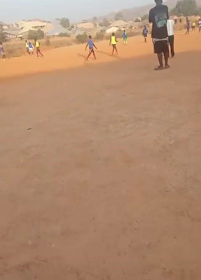 A low-angle, eye-level, medium shot captures a soccer game in progress on a dry, dusty field