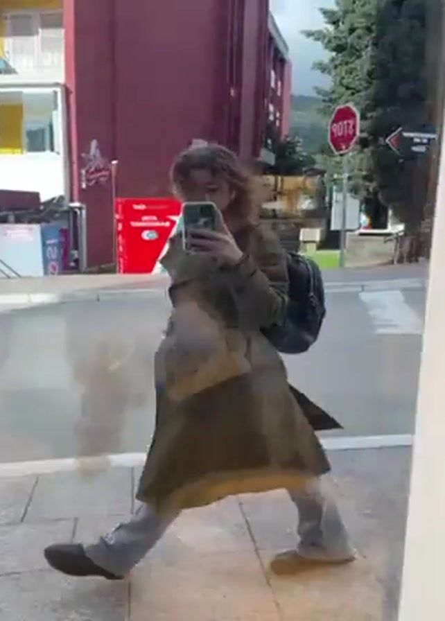 A person with curly hair and a brown coat stands on a sidewalk, looking at their smartphone. They are positioned in front of a reflective surface, likely a window or mirror, capturing their reflection. The individual holds the phone in their hand, seemingly taking a photo or video of themselves. Behind them, there is a street scene with buildings, signage, and some greenery. The environment suggests an urban or semi-urban setting with pedestrian and vehicular traffic. The video shows the person's movements and the changing background as they move around, likely adjusting their pose or angle for the camera. The overall scene appears to be a casual moment of self-portraiture within a bustling city landscape.