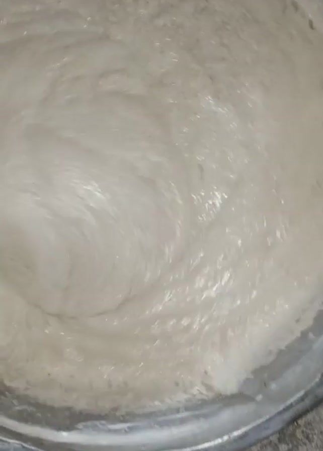A person is mixing a pale, thick, wet mixture in a metal bowl