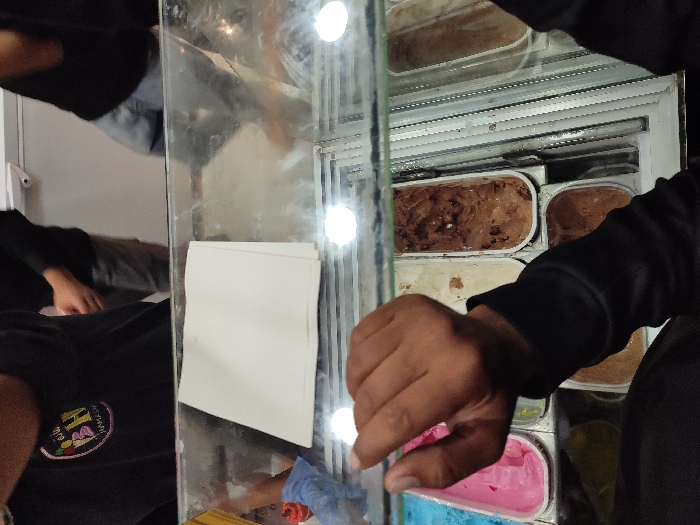 An opened ice cream display case reveals a variety of flavors in metal containers. A hand reaches towards the lower section of the case, near a blue ice cream container. Above, containers hold chocolate, tan, and pink ice cream. A stack of white napkins sits on the glass display surface. A person in a black long-sleeved shirt is visible, along with reflections in the glass.