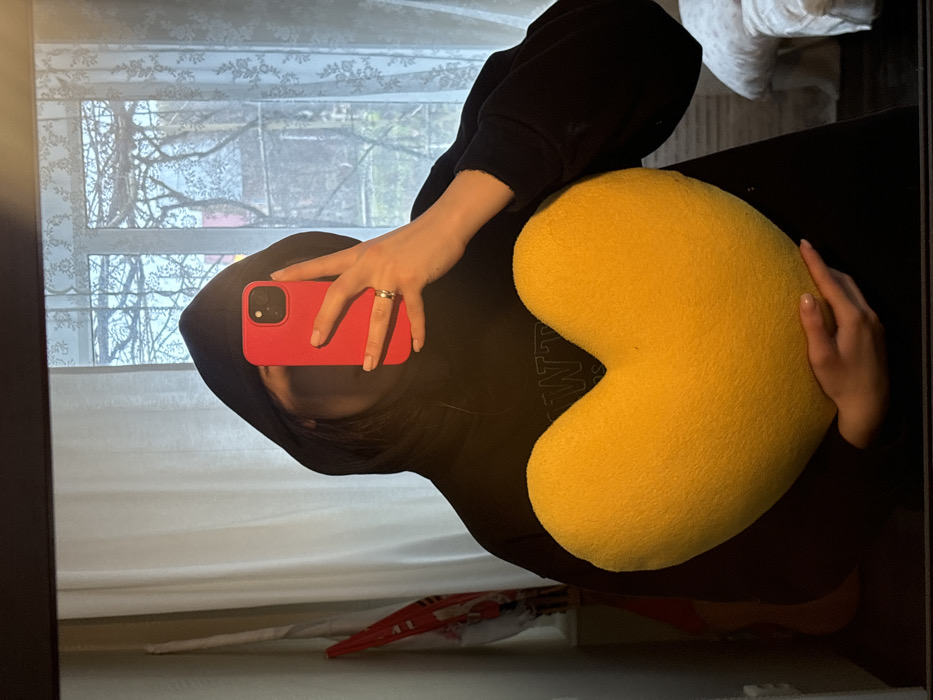 The image displays a mirror selfie of an individual positioned from the mid-chest upward. The person's face is entirely obscured by a red smartphone, held in their right hand for the purpose of photography. A silver-colored ring is visible on the ring finger of the hand holding the phone. The individual is wearing a dark-colored, hooded sweatshirt with the hood pulled over their head; partially visible lettering "WT" is discernible on the front of the garment. Both hands cradle a large, yellow, heart-shaped cushion or pillow made of a soft, textured fabric. The background, reflected in the mirror, reveals an indoor setting with a large window. The window, divided into multiple panes, is draped with light-colored, patterned lace curtains. Beyond the window, an outdoor scene features bare tree branches, suggesting a season of winter or early spring. To the left of the individual in the reflection, a vertical object, partially red, is visible. To the right, a fragment of a light-colored, upholstered furniture item can be seen. The general environment is consistent with a private residence. Based on external information, this scene is situated in Slavyansk-na-Kubani, Russia.