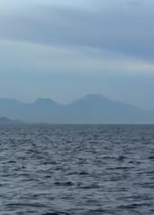 body of water under a cloudy sky. In the distance, there are silhouettes of mountain ranges. The water has slight ripples on its surface.