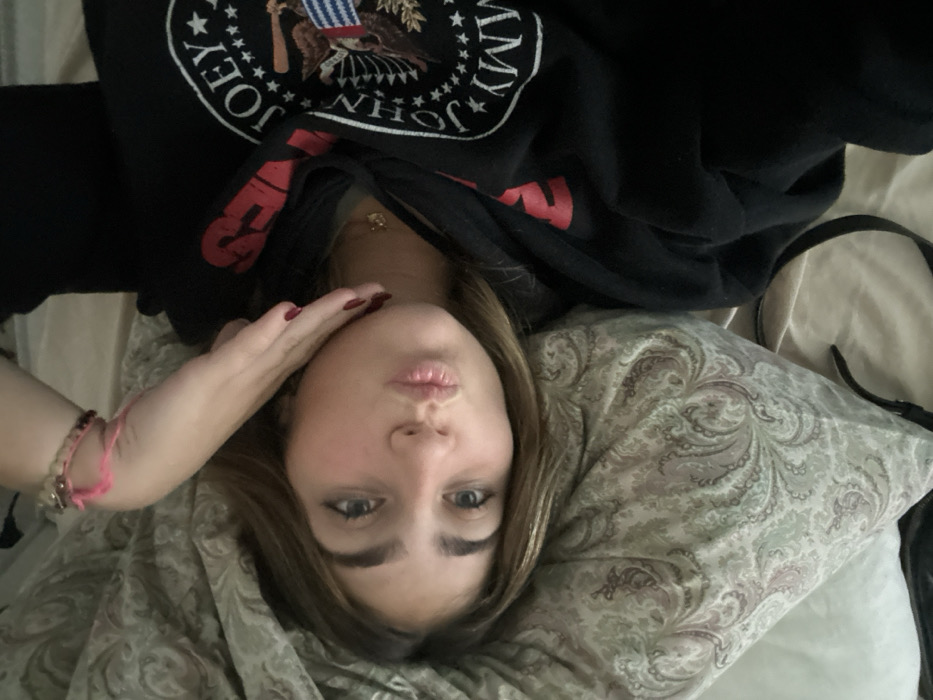 A female subject is depicted in an indoor setting, likely a bedroom, within Aldoar, Foz do Douro e Nevogilde, Portugal. She is lying on her left side, her head resting on a pillow with a light green, grey, and brown paisley pattern. Her medium brown hair is spread around her head. She has light-colored eyes and is looking directly at the camera with pursed lips. Her left hand, adorned with dark red nail polish and multiple wrist bracelets (including pink string and braided types), rests against her left cheek and jawline. She wears a black hooded sweatshirt with red text on the left shoulder/sleeve and a circular white emblem on the right chest, featuring stars, text (e.g., "JOEY", "JOHN", "ARMY"), and an eagle holding an American flag shield. A delicate gold-colored necklace with a small charm is visible on her neck. A black strap is partially visible in the lower right foreground.