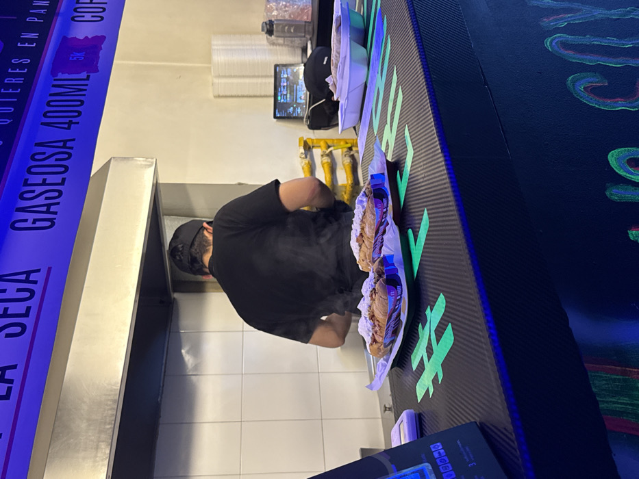 A worker wearing a black shirt and cap stands in front of a tiled wall next to a stainless steel ventilation hood. Steam rises from food items on a counter, possibly sandwiches wrapped in white paper, each resting next to a neon green hashtag symbol. The counter is part of a structure with a black surface adorned with colorful graffiti. A blue sign with white text is visible, advertising "GASEOSA 400ML." Other items are partially visible in the background, including stacks of white cups and an electronic device.