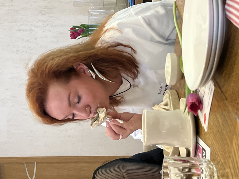 This image depicts an indoor dining establishment in Pushkin, Russia. The central subject is an adult female with reddish-brown, disheveled hair, facing right in profile. She is wearing a white oversized t-shirt with dark text "ВРЕМЯ СМЕНЫ" (VREMYA SMENY) across the chest and a black necklace with a silver or metallic geometric charm. Her left ear features multiple piercings, including two small studs, one small hoop, and a large, elongated, silver-toned earring that extends along the lower ear. A small silver stud is visible in her right nostril. She is actively eating a large, pleated dumpling (khinkali), holding it with her right hand, which has a light-colored ring on the ring finger and manicured nails. A small white napkin or tissue is wrapped around the base of the dumpling as she brings it to her mouth, her eyes closed or focused downwards. To the left, a portion of another individual is visible, showing a dark, possibly mesh, garment and an arm. The setting is a wooden table with various dining items. These include a tall, light-colored ceramic mug or pitcher on a saucer, a small white ceramic bowl, and a stack of three white ceramic plates. Additional khinkali are present on light-colored ceramic dishes. A clear glass with a textured pattern is situated on the far left. A single pink tulip lies on the table near the ceramic mug, and a white card with red text is visible near the stacked plates. The background features a light-colored, possibly textured wall. To the far left, light-colored wooden paneling or furniture is present, along with a white hook or hanger. On the right side of the background, a clear glass vase holds a small bouquet of three pink or purple tulips, and other clear glass objects are discernible. The scene is brightly lit.
