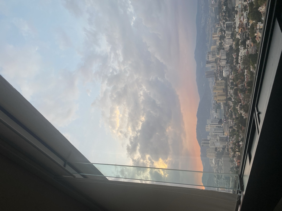 View from a high vantage point, possibly a balcony or window. The sky is filled with light-colored clouds, with some areas tinged with orange hues, likely from the setting sun. In the distance, a city stretches out, nestled against rolling hills or mountains. Buildings are visible in the cityscape. The balcony or window structure frames the view, with metal supports and a glass panel visible. The photo appears to be taken during a time when the light is soft and diffused.