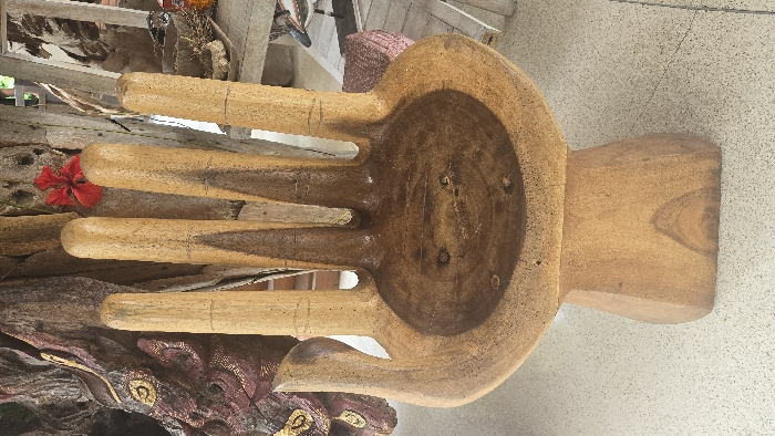 A uniquely designed wooden chair resembles an open hand. The seat is a rounded, darkened wood with visible knots, attached to a solid wood back. The chair's armrests are fashioned as four elongated fingers, each marked with a darker central line. The chair rests upon an intricately carved wooden base, accented with gold and red details. A vibrant red flower adds a pop of color.
