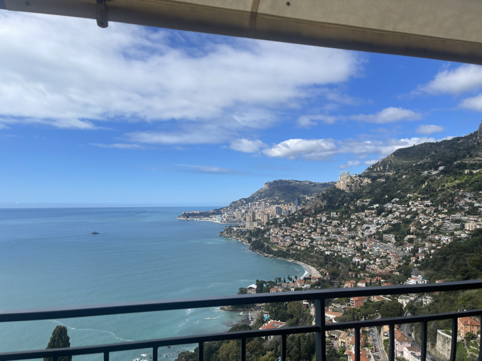 panoramic view from a balcony overlooking the Mediterranean Sea and the town of Roquebrune-Cap-Martin, France