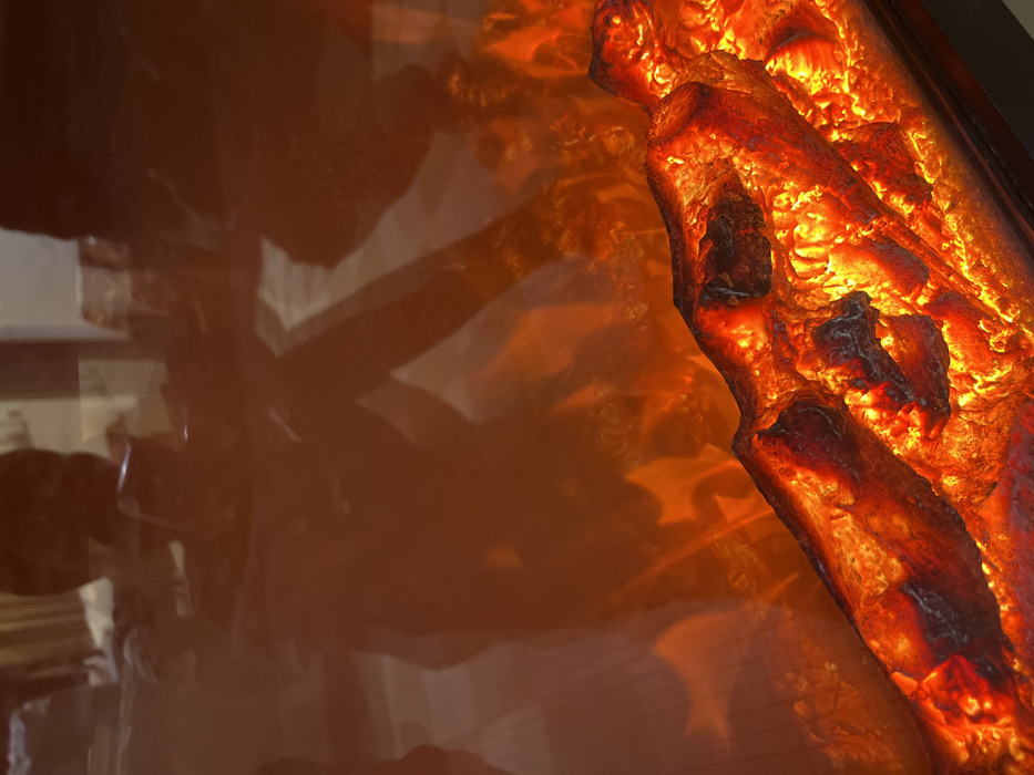 A close-up image reveals an illuminated, rocky texture on the right side, glowing with orange and red hues. The left portion reflects a distorted, darker image, possibly of furniture or objects in the surrounding environment. The overall scene is bathed in warm, ambient light, creating a sense of depth and dimension. The rocky texture appears rugged and uneven, with small crevices that enhance the glow.