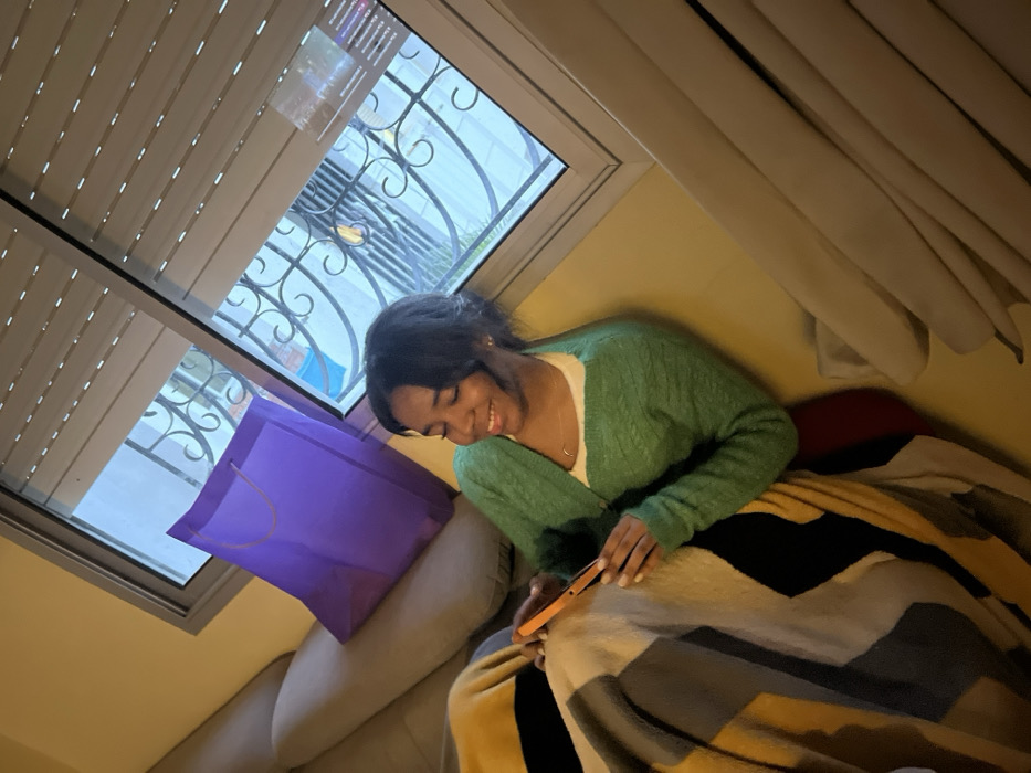 A young woman sits on a couch near a window with blinds, smiling down at her phone. She wears a green sweater and a necklace. A purple shopping bag rests on the couch beside her. She's covered with a multicolored geometric-patterned blanket. Curtains hang near the wall behind her. The scene is lit by natural light from the window and soft overhead lighting.