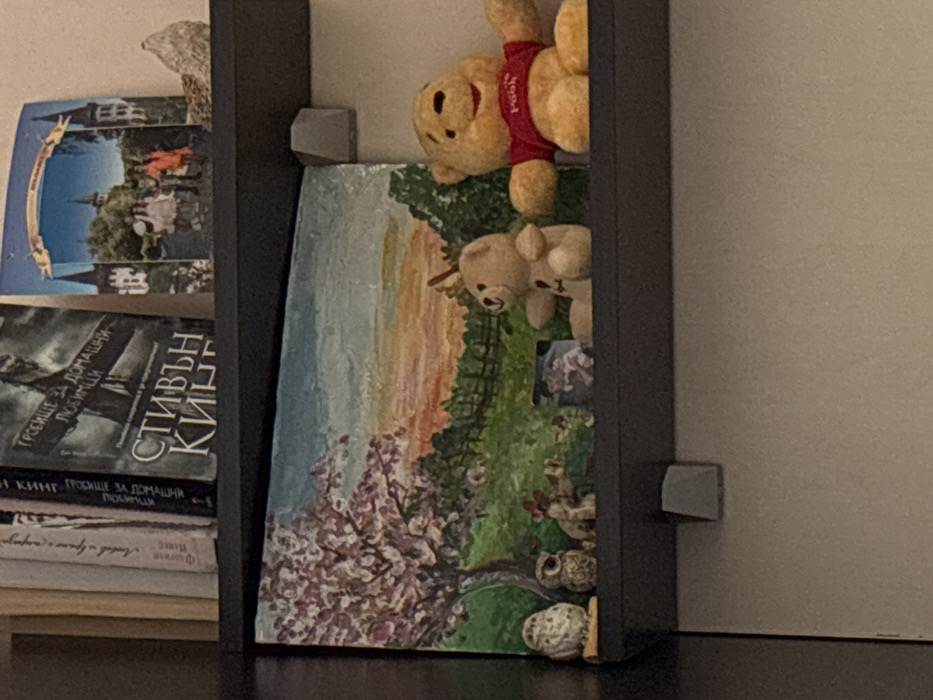 An interior scene displays two dark-colored shelves mounted against a light-colored wall. The setting is identified as a residential location in Sofia, Bulgaria, based on the presence of a Bulgarian-language book. On the upper shelf, a stack of books stands vertically. The most prominent book is a Bulgarian edition of Stephen King's "Pet Sematary" ("ГРОБИЩЕ ЗА ДОМАШНИ ЛЮБИМЦИ" by СТИВЪН КИНГ), recognizable by its dark cover and Cyrillic script. To the right of the books, a postcard or small framed picture depicts a European-style castle, with three individuals (two adults and one child) standing in the foreground. Further to the right, a small, textured, light-colored decorative object, possibly a rock or ceramic item, is positioned. The lower shelf features a horizontally oriented landscape painting depicting a tree with pink blossoms on the left, a green field with small white sheep-like figures and a fence in the middle, and a sky with warm sunset or sunrise colors on the right. Arranged in front of this painting are several objects: from left, two small owl figurines, followed by a small figurine resembling a dog or deer, and another indistinct small figurine. Next is a small framed photograph showing two individuals. To the right, a small, light brown teddy bear plush toy sits. Finally, on the far right, a larger yellow Winnie the Pooh plush toy, wearing a red shirt, also sits.