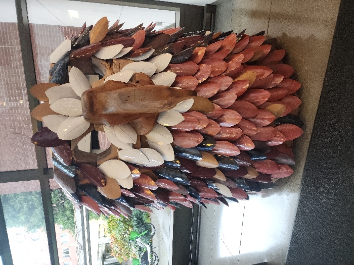 This image depicts a large, cylindrical, abstract sculpture, approximately human-height, situated indoors. The sculpture is composed of numerous overlapping, glossy, leaf-shaped tiles or scales in varied tones of maroon, rust, dark brown, dark blue, and cream. A central, vertically oriented, rough-hewn wooden element forms a prominent beak-like or facial feature on its upper portion. The sculpture stands on a polished light-grey floor, with a dark-grey carpet in the immediate foreground. Behind the sculpture, large, dark-framed windows offer a view of an outdoor urban setting in Seattle, United States. Visible outside are green trees, a multi-story building with light-colored facades, and a paved area where two green and white shared bicycles (Lime bikes) are parked.
