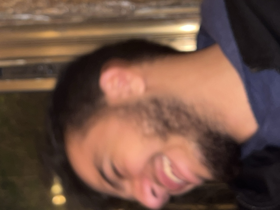 A blurry portrait depicts a man with dark hair and a beard. He is smiling, with a glimpse of his teeth visible. He wears a dark blue or black garment on his upper body. The image is angled, with the man's head tilted. The background is undefined but appears to have a golden or yellow-tinted area in the upper portion. Overall, the picture's clarity is low, making details difficult to discern.