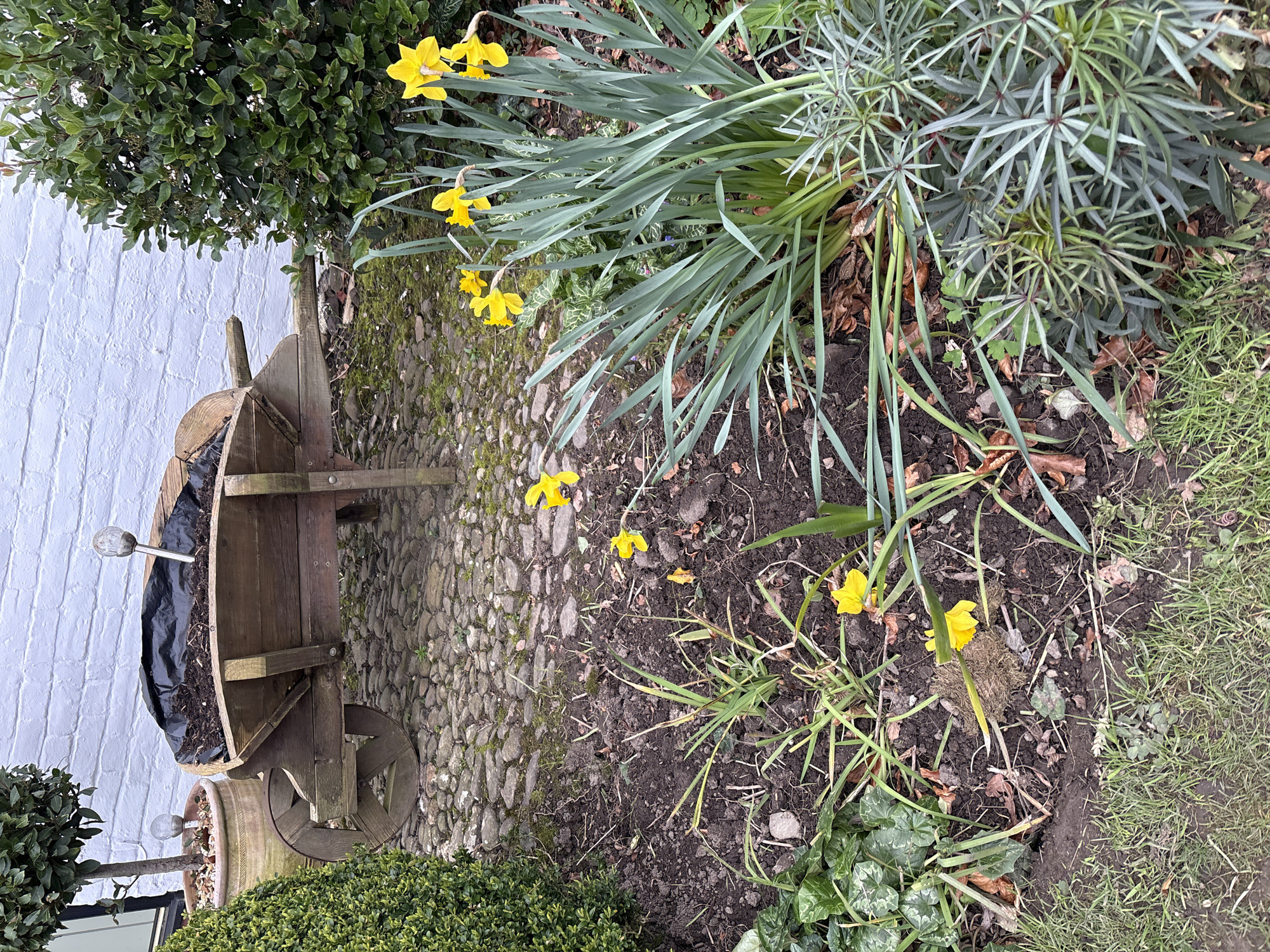 The image depicts a garden scene in Longden, United Kingdom. A wooden wheelbarrow filled with soil is positioned near a white brick wall. Daffodils are prominently featured, both clustered and scattered in the garden. Various other plants and greenery are present. The ground surface transitions from a cobblestone path near the wheelbarrow to soil and grass. The overall impression is a garden setting with a mix of cultivated and natural elements.